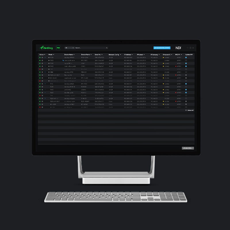 Fleet Manager は、BirdDog 製品の管理、監視、更新作業を容易にします。どの BirdDog デバイスも Fleet Manager に自動的に表示され、ステータス、IP アドレス、サブネット、デバイス名、ストリーム名、シリアル番号、ファームウェアバージョン、PTZ カメラの MCU バージョンなど、すべての関連デバイスの情報をすぐに参照できるようになっています。