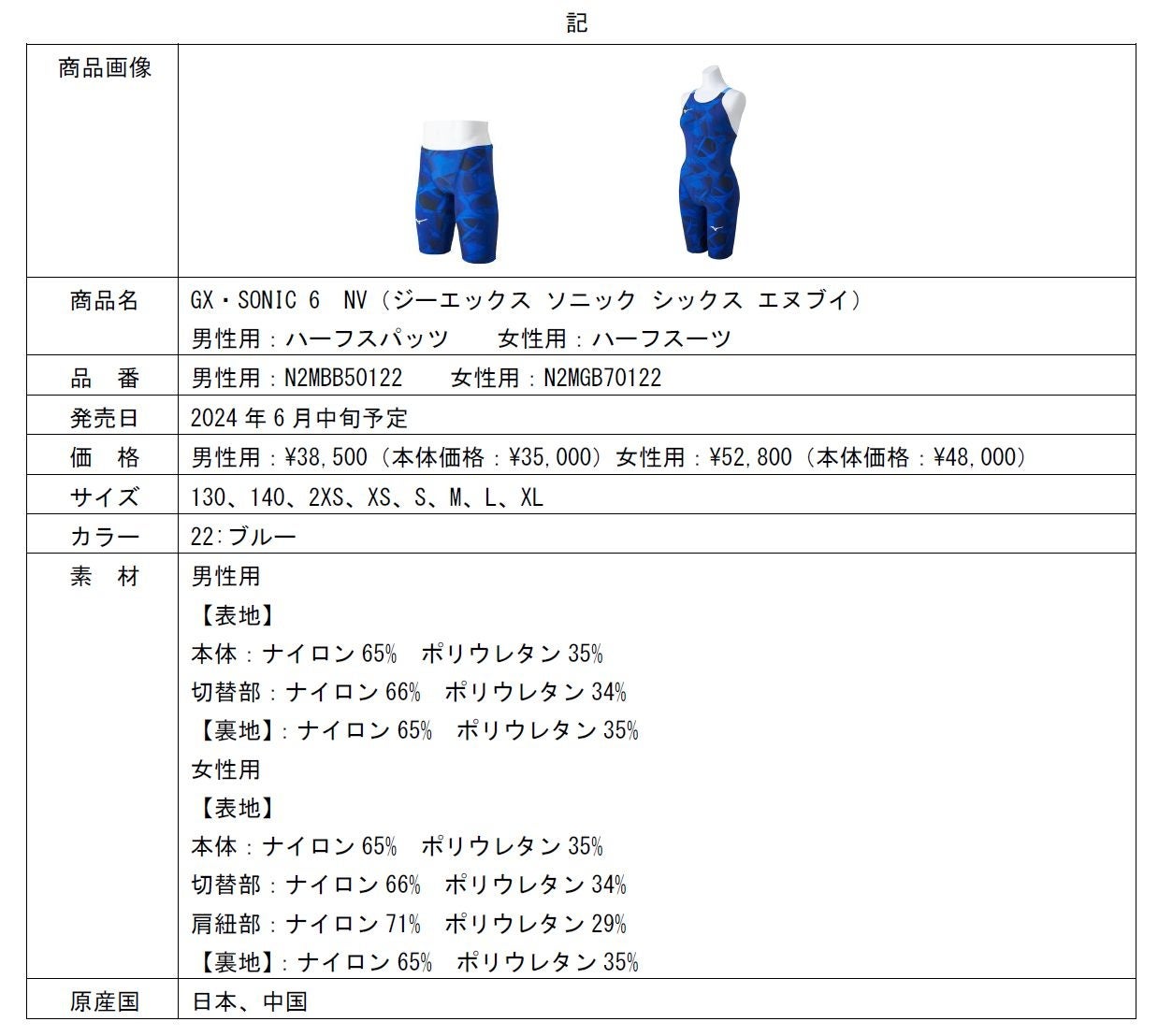 ミズノ競泳用水着「GX・SONIC 6」の2024年新デザイン発売