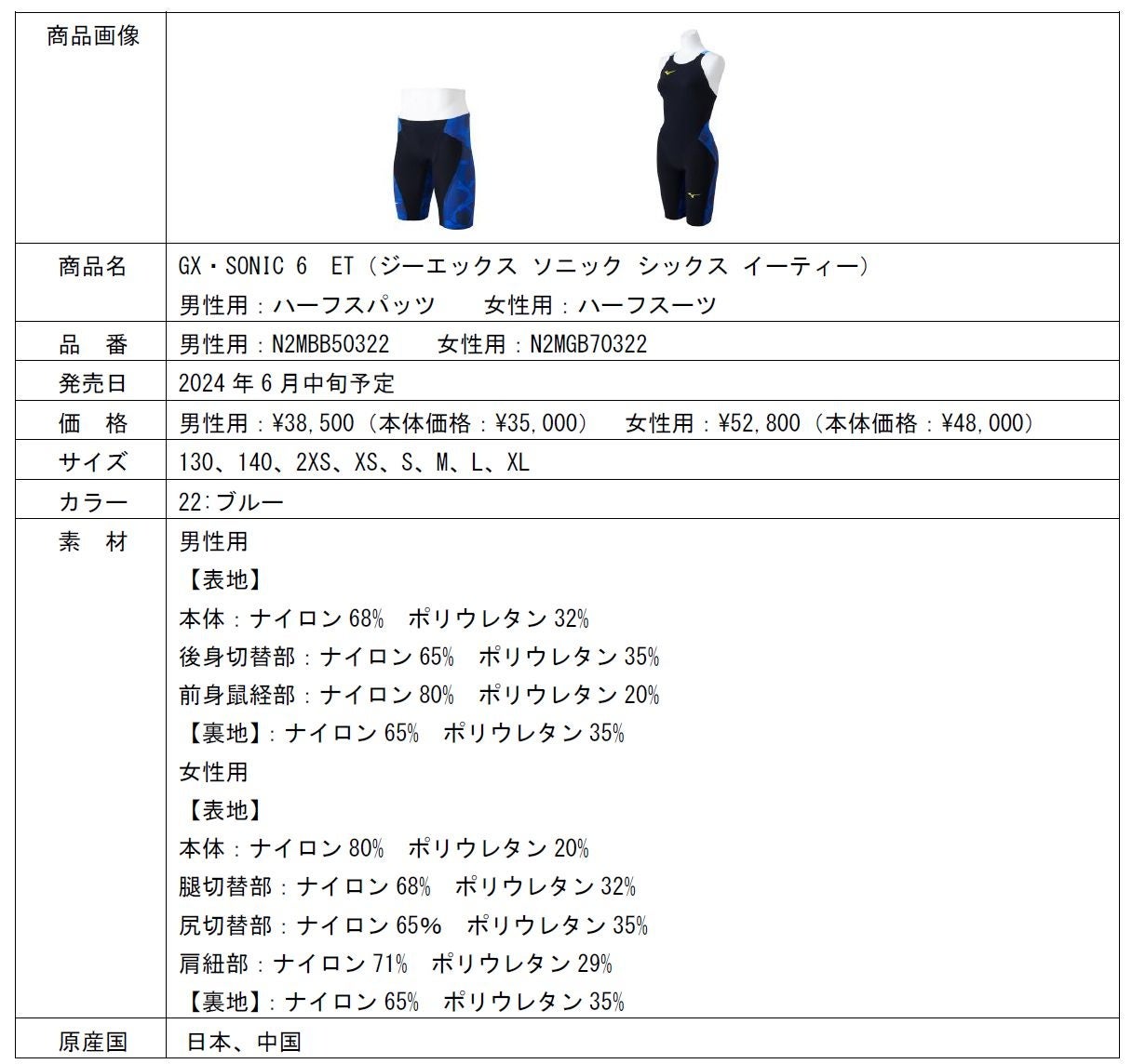 ミズノは、世界水泳連盟(World Aquatics)承認のトップ選手向け競泳用水着「GX・SONIC 6(ジーエックス ソニック シックス)」のニューデザインモデルをミズノスイム品取扱店、ミズノ公式オンラインで3月27日18時から予約販売を開始し、6月中旬から販売します。ニューデザインにはミズノがサプライヤー契約を締結している国内の14競技連盟・協会で横断的に供給する「MUGEN CONCEPT(ムゲンコンセプト)」を採用しました。