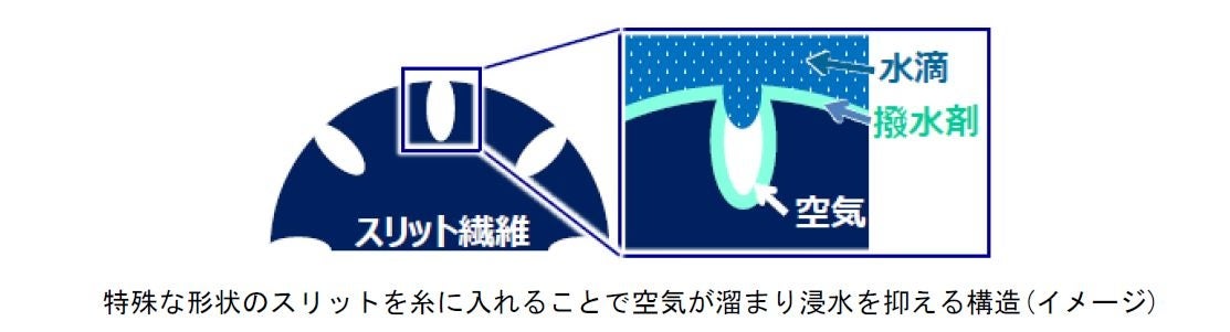 「GX・SONIC 6」には、従来モデルに採用していた撥水加工を施した素材を進化させた『SONIC LIGHT RIBTEX UW-Ⅱ(ソニックライトリブテックスユーダブルツー)』を採用しています。この素材は、ハスの葉の構造をヒントにし、表面にサイズの異なる微細な凹凸を持たせています。また原糸の断面構造に着目し、糸を特殊なスリット形状に加工することで、空気を取り込みやすくなり、水との接触面積が減少し、動きの中でも糸への浸水を抑えることができます。その結果、水着の水中軽量を従来品に比べ最大約6.2%※1軽量化しています。