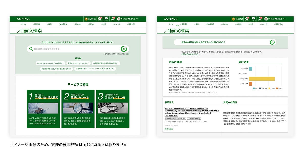 「AI論⽂検索」は医師専⽤コミュニティサイト「MedPeer(medpeer.jp )」に登録している医師会員が利⽤することができ、主に臨床課題に対する論⽂検索や回答作成の⼿間や時間を減らすことができます。