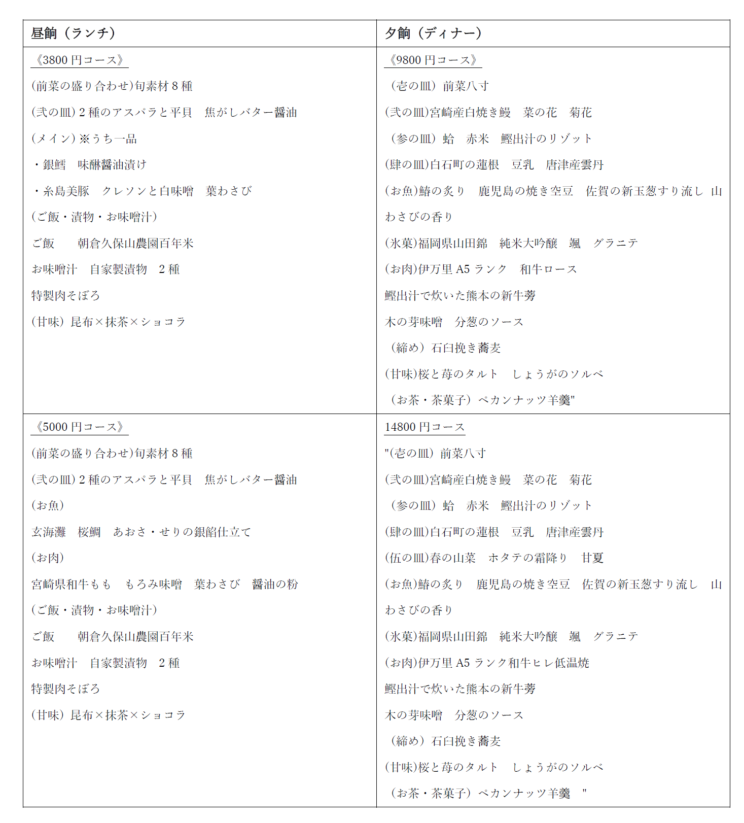 九州各地の素材を厳選し、素材の旨味をお楽しみいただく月替わりのテーマに沿ったコースをランチ・ディナーともに2種類ご用意しました。
