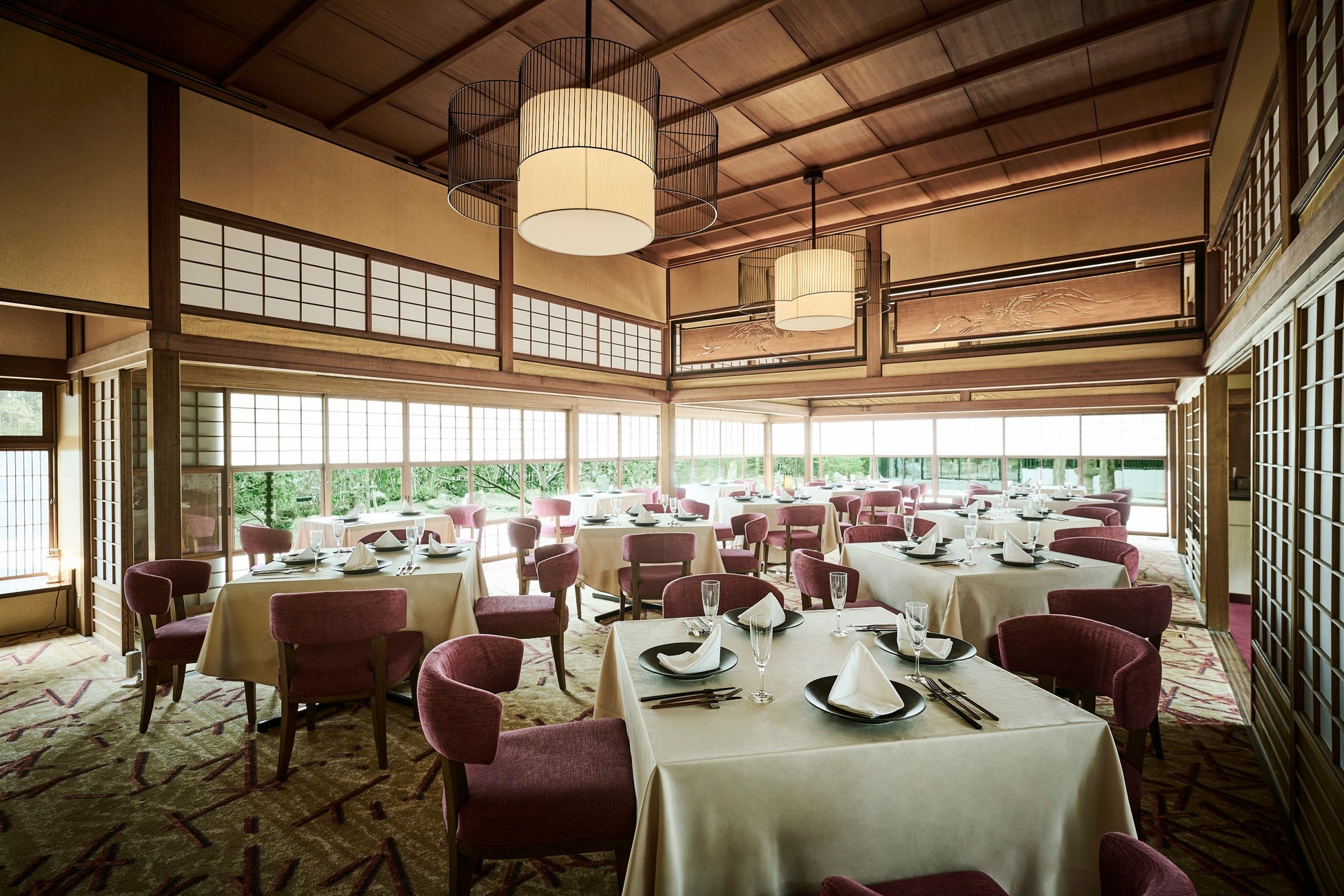 レストランとして使用する大広間は、本格的な書院造りが施され、壁が少ない設計となっているため、障子を開けると庭園と一体化するような開放的な空間となっております。鳳凰の透し彫りや、渦と波を表現した欄間、外の景色が揺らいで見える手作りガラスなどはそのまま保存されており、また、高級武家などでしか使用されることがなかった当時の高級和紙を使用した“表具壁”のお部屋でお食事をお楽しみいただきます。
