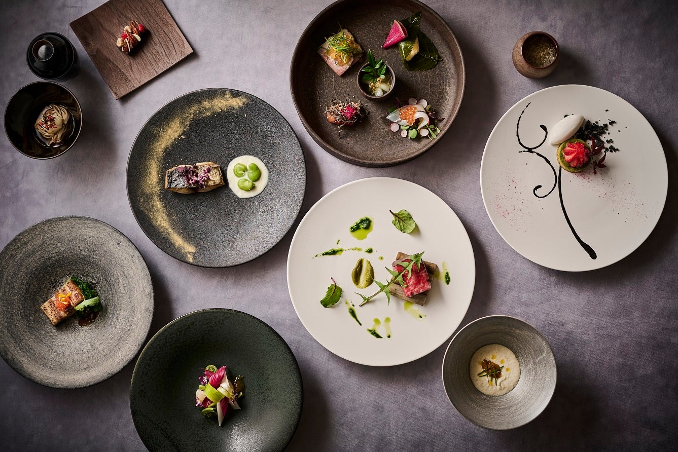 レストランでは自然の恵みを最大限に生かす「九州里山キュイジーヌ」を提供します。海にも山にも恵まれた九州の厳選された素材を用いて、日本ならではの出汁・茶などの食文化を大切にしながらも、和食のみならずフレンチなど様々な技法を調理に取り入れた料理です。