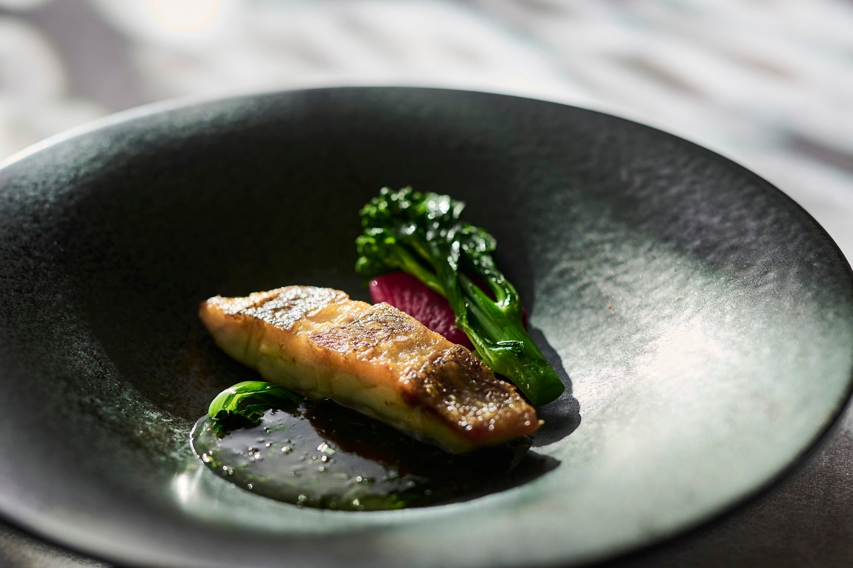 玄界灘で獲れた鰆を昆布〆にして軽くあぶり、こだわりの出汁を合わせた佐賀の新玉ねぎのピュレを添えました。フレッシュの西洋わさびを軽く削り、鰆の旨味と新玉ねぎの甘味、西洋わさびの香りをお楽しみください。