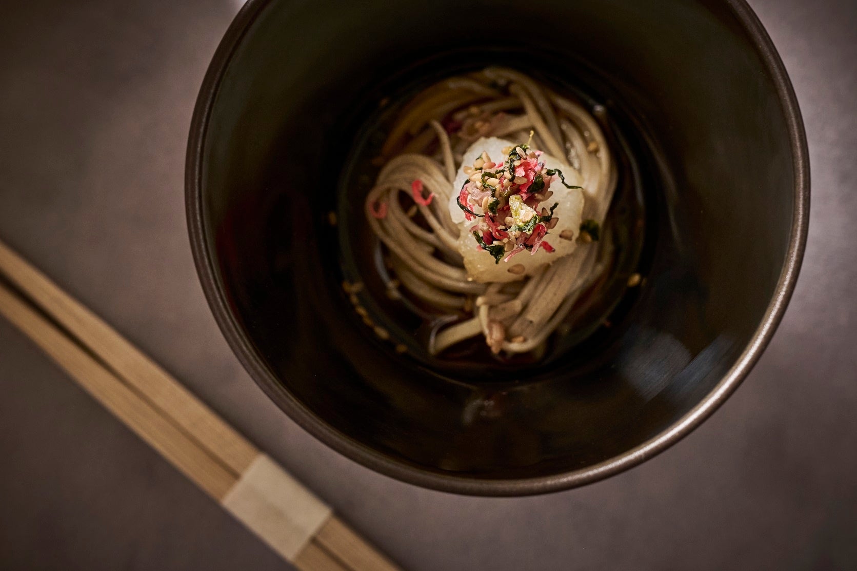 コースの締めには、北海道で一番面積が小さく人口も一番少ない音威子府村にて作られている蕎麦粉を使用した蕎麦をご用意します。寒暖差が激しい音威子府村で作られる蕎麦粉は、香りや旨味が強く蕎麦そのものの味わいを楽しめます。この蕎麦の香りを体験いただきたく、こだわりの出汁つゆに加え、塩でも蕎麦をお楽しみいただきます。
