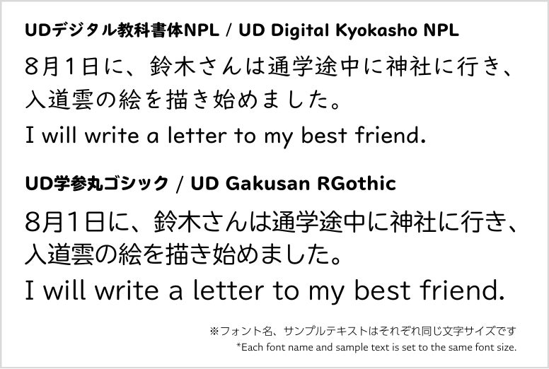 ※「UDデジタル教科書体NPL」は Microsoft Windows 10以降に標準搭載されている「UDデジタル教科書体」と仕様が異なります。仕様の詳細はこちらからご確認いただけます。