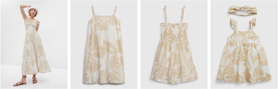 ファミリーリンクアイテムも豊富に取り揃えており、その中でも涼しげなリネン素材を使用したフラワープリントアイテムは、家族全員でお揃いコーデを楽しめます。メンズ、ボーイズ、トドラーボーイズは半袖シャツ、ウィメンズ、ガールズ、トドラーガールズはキャミソールドレス、ベビーでは半袖シャツ×ショーツやヘアバンド×ドレスのセットがラインナップ。