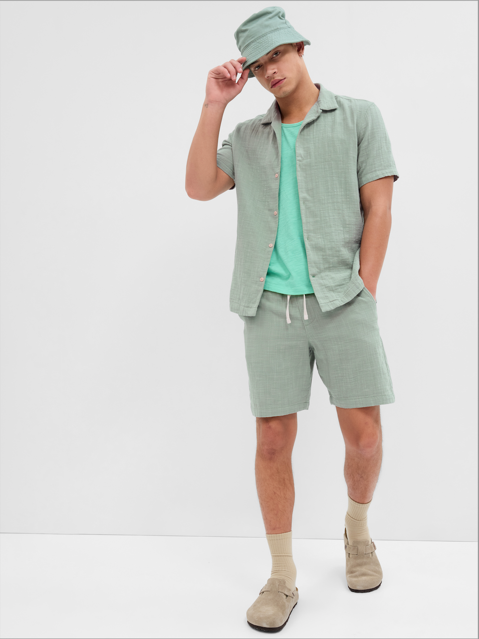 【Men】ガーゼ バケーション スタンダードフィットシャツ ¥5,990 / ウォッシュウェル 8インチ イージーショートパンツ ¥4,990