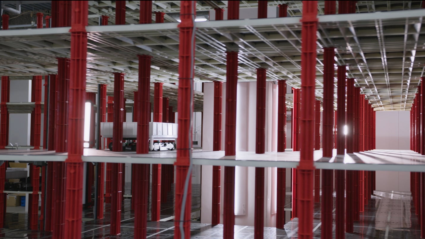 ロボットが自動倉庫内を走行している様子