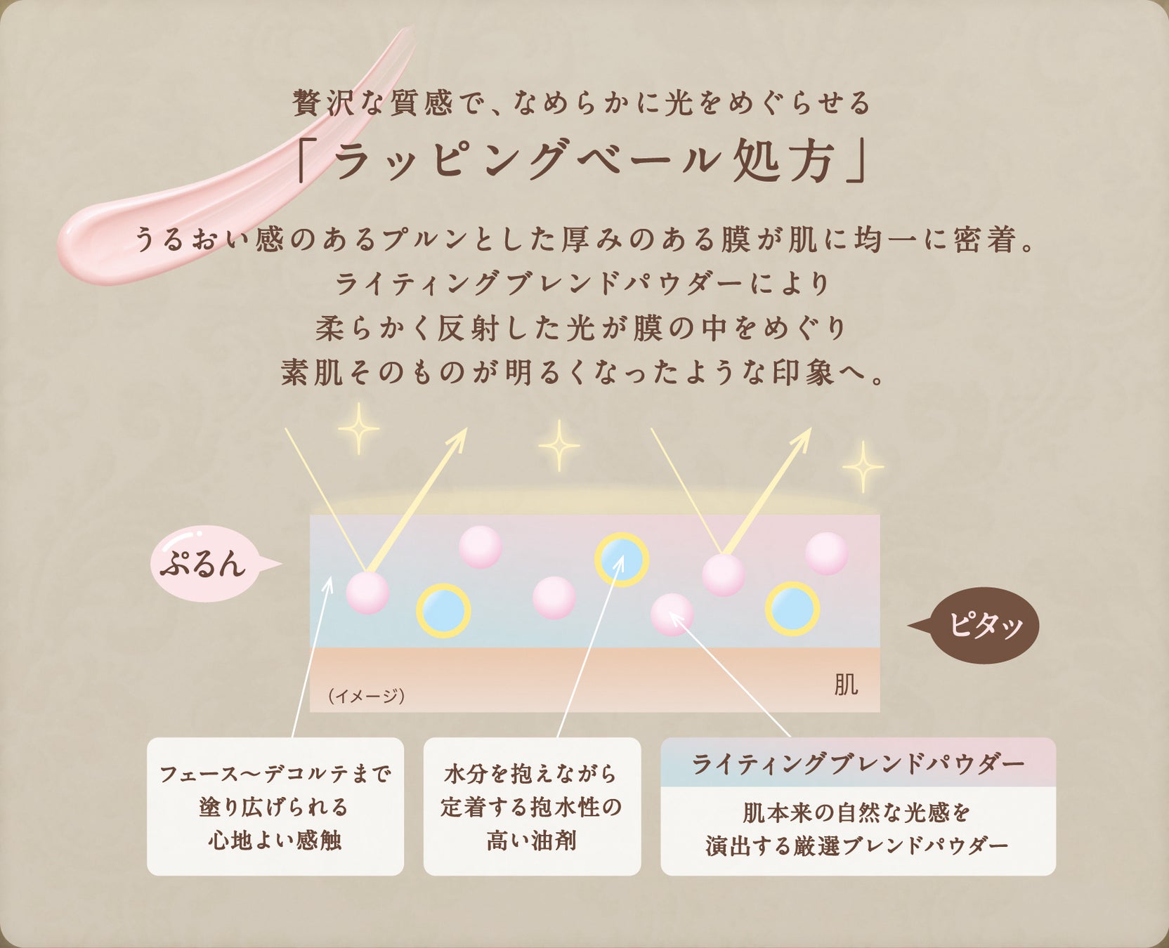 ● つるんと肌のキメを整えて、まるでなめらかなベールをまとったような、明るく透明感のある印象の肌に仕上げます。