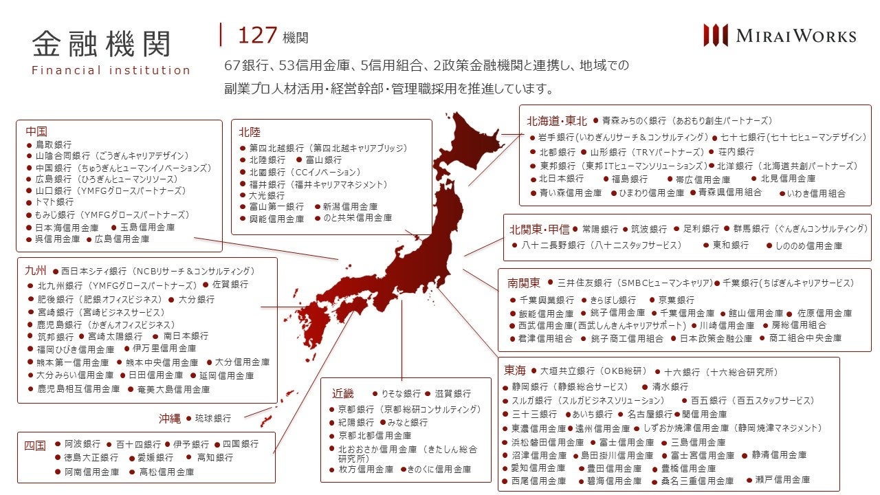 株式会社みらいワークス(本社:東京都港区、代表取締役社長 岡本 祥治、以下「当社」)は、日本海信用金庫(本店所在地:島根県浜田市、理事長 徳富 悠司)と人材支援による地域経済の活性化を目的とした業務提携契約を締結したことをお知らせいたします。当社は今回の提携をもって、127の地域金融機関と地方転職・副業人材の活用を推進することとなります。(*1)