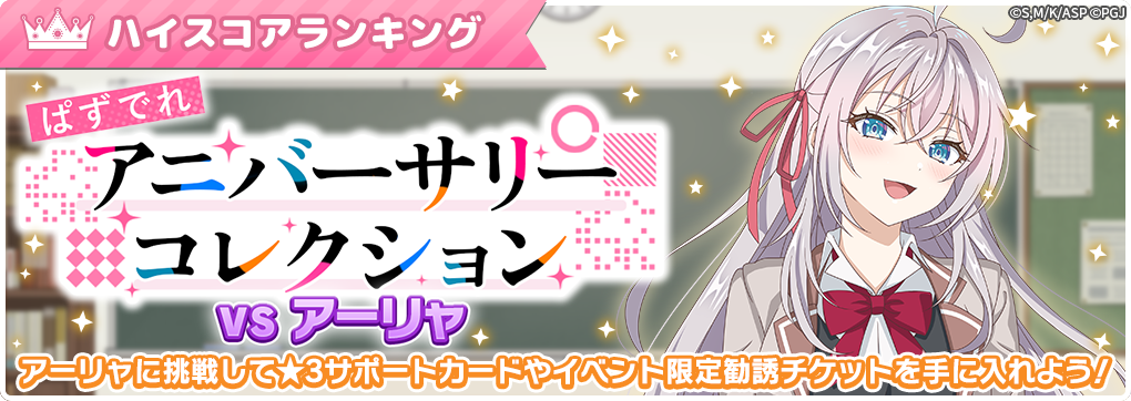 11月28日(金)よりイベント「ぱずでれアニバーサリーコレクションVSアーリャ」を開催します。当イベントでは、期間中のハイスコア順位に応じたランキング報酬が獲得可能です。またイベントステージで集めたポイントで、イベント限定のサポートカードやアイテムが獲得できる交換所も登場。繰り返し挑戦してよりたくさんのポイントを集め☆3サポートカードや勧誘チケットを手に入れよう!