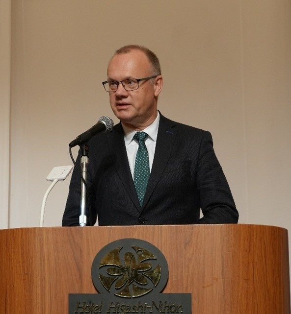 本年の入社式には特別なゲストをお迎えすることができました。ドイツ連邦共和国のITリーディングカンパニーDATEV社のCEO、ロバートマイヤー博士をご紹介いたします。DATEVはTKCと同じ1966年に創業し、両社はともに今年創業60周年を迎えました。TKCとDATEVは1972年から連携を重ねておりこの54年間にわたって、相互に情報交換を重ねてきました。それではマイヤー博士から祝辞をいただきます。