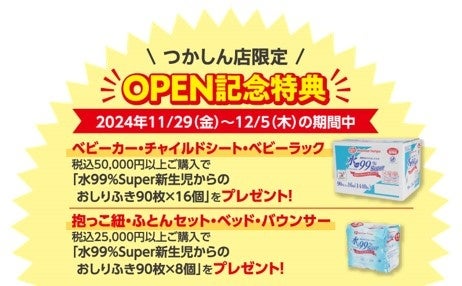 さらに期間中、ベビーカー・チャイルドシート・ベビーラックを税込50,000円以上ご購入の方へ「水99%Super 新生児からのおしりふき 90枚×16個」を、抱っこ紐・ふとんセット・ベッド・バウンサーを税込25,000円以上ご購入の方へ「水99%Super 新生児からのおしりふき 90枚×8個」をプレゼントいたします。