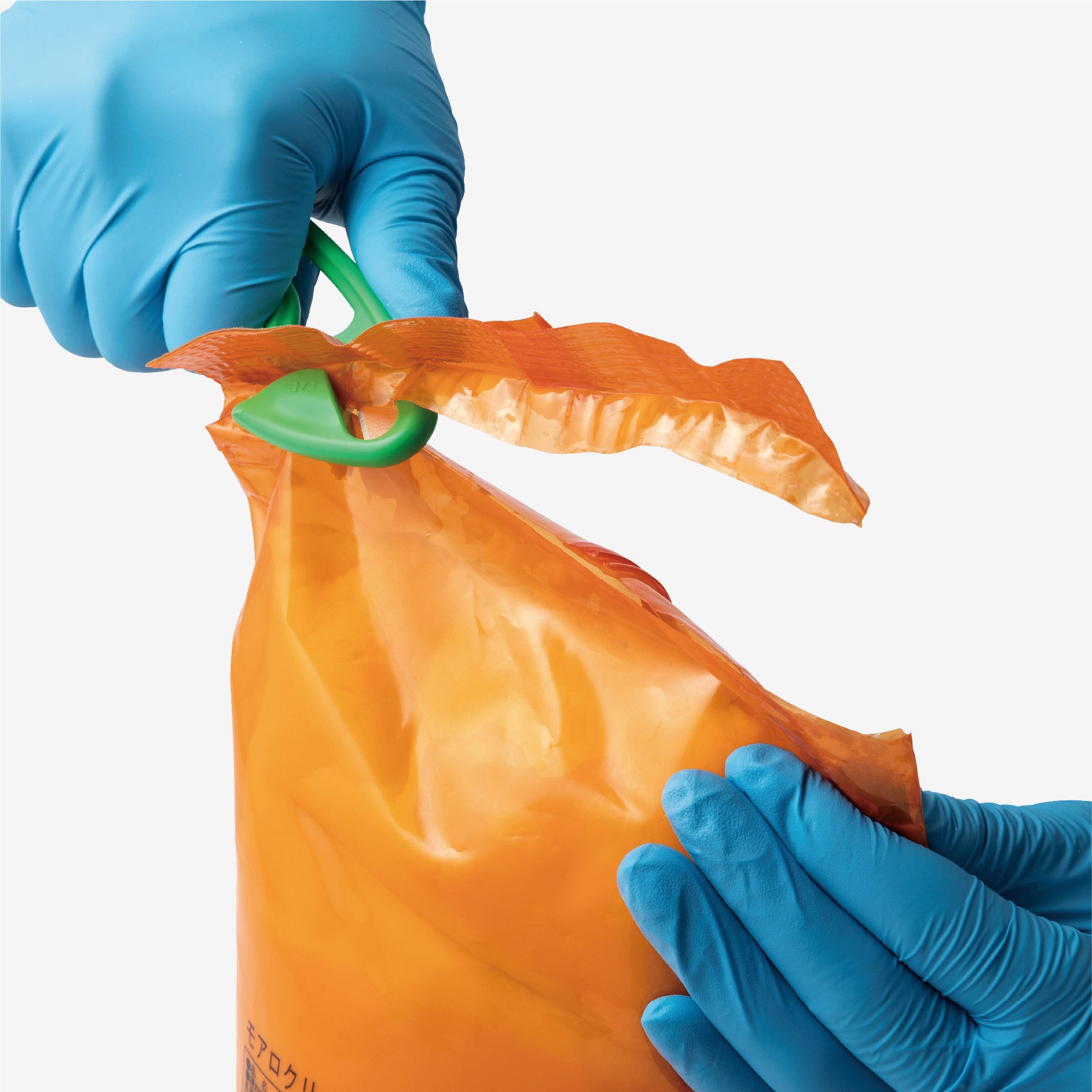 ※ 異物混入対策を目的とした、フィルム面に沿った切断開封をサポートするガイド、グリップの構造と刃の設計(特許第6599587号)
