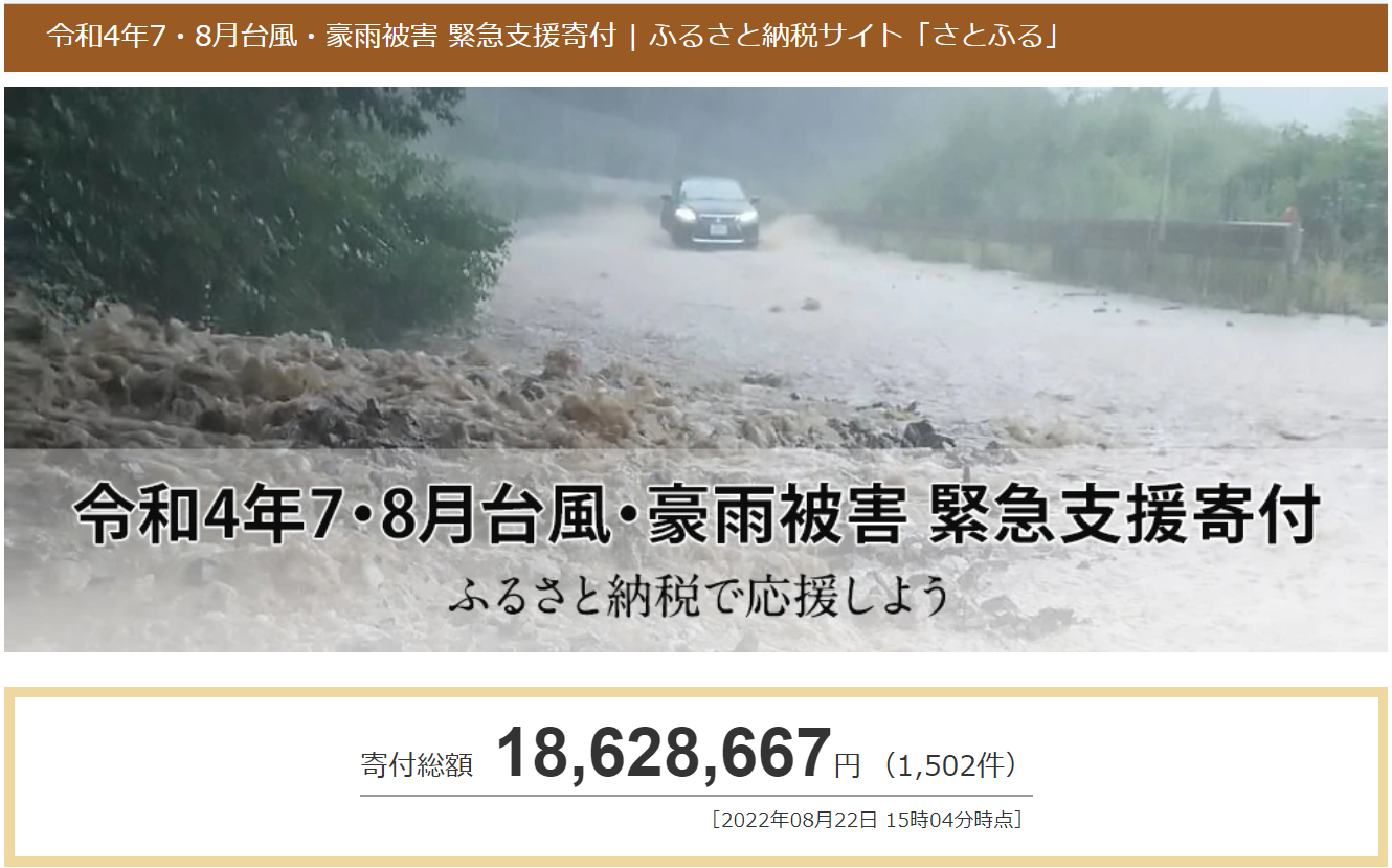 ふるさと納税ポータルサイト「さとふる」(https://www.satofull.jp/)を運営する株式会社さとふる(本社:東京都中央区、代表取締役社長:藤井 宏明)は、2022年7月8日に開設した「令和4年7・8月台風・豪雨被害 緊急支援寄付サイト」(https://www.satofull.jp/static/oenkifu/202207_typhoon.php)にて、8月22日より、青森県黒石市の寄付受け付けを開始します。これにより本サイトで扱う自治体数は39自治体となりました。7月以降に発生した台風・豪雨被害への寄付総額は8月22日午後3時時点で、本サイトを通して1,800万円以上(1,500件以上)となりました。各自治体に集まっている寄付総額などの最新情報は、「令和4年7・8月台風・豪雨被害 緊急支援寄付サイト」に記載しています。