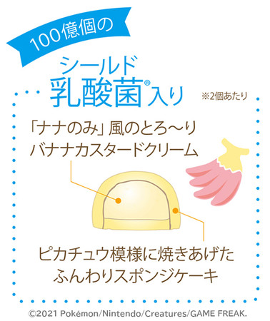 愛くるしいピカチュウ模様に焼きあげたふかふかスポンジケーキに、「ナナのみ(※)」をイメージした“ナナのみ風とろ~りバナナカスタードクリーム”がたっぷりはいっています。“ピカチュウとおやつタイムチュウ”を楽しんで!