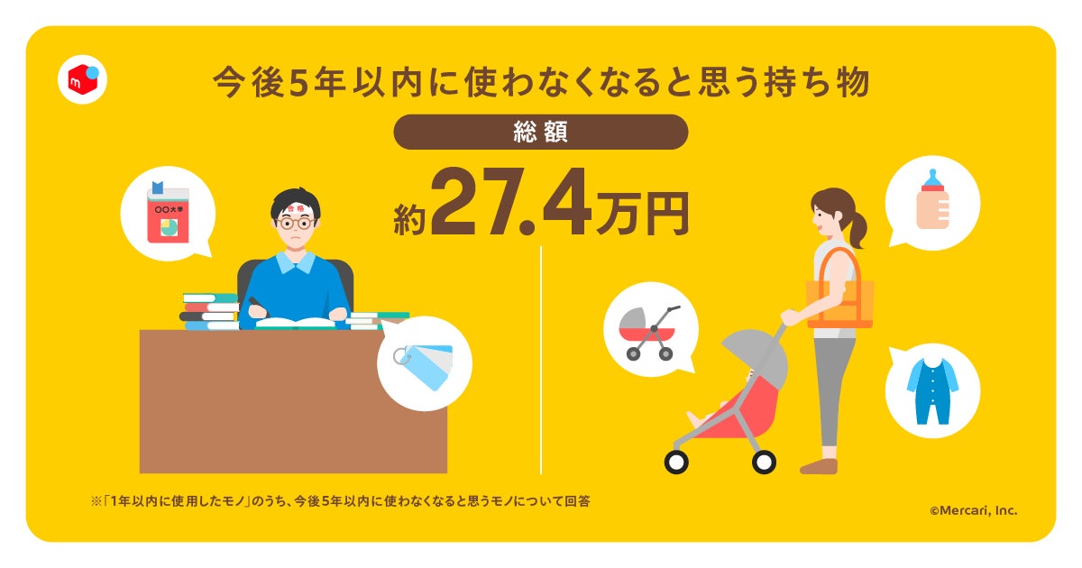 現在利用している持ち物のうち、今後5年以内で使わなくなると思うモノの数量を調査し、“今後使わなくなるモノ”の金額を算出したところ、国民一人あたり平均約27.4万円となりました。