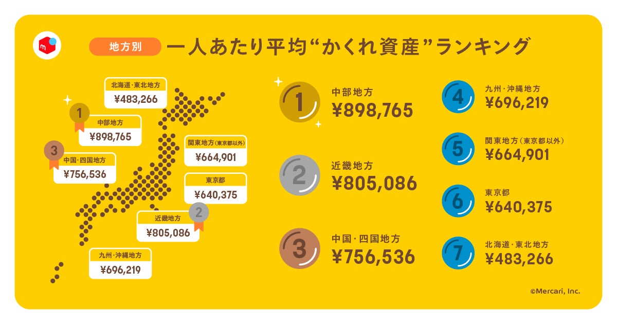 地方別で一人あたり平均“かくれ資産”をみたところ、最も多いのは中部地方で平均898,765円、次いで近畿地方で平均805,086円、中国・四国地方で平均756,536円となりました。