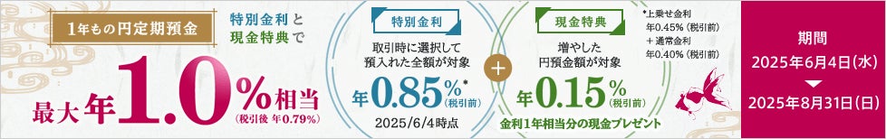 本キャンペーンでは、2025年6月4日(水)から8月31日(日)の期間中に新規で預け入れされた1年もの円定期預金に対し、通常金利年0.40%(税引後 年0.31%)(注)に年0.45%(税引後 年0.35%)を上乗せした【①】特別金利年0.85%(税引後 年0.67%)を提供します。