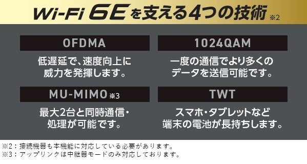 ※1:Wi-Fi 6Eの機能を利用するには端末側も対応している必要があります。このほか機能によっては端末側の対応が必要です。