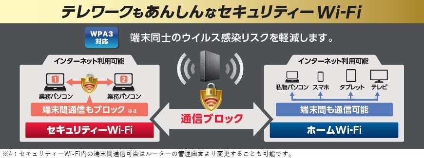 新規格の採用だけでなく、OFDMA/1024QAMをはじめとする多彩な機能を搭載することで、通信の安定化と高速化を実現します。また、Wi-Fiルーター買い換え時の移行作業や、導入時の設定作業も容易になっています。セキュリティー面では、より強固なセキュリティーを実現する「WPA3 Personal」を採用するなど、Wi-Fi利用時の各種セキュリティーを強化しています。このほか、お子様をネットの使いすぎから守るタイマー機能や、離れ家とのWi-Fi通信を可能にする「中継器離れ家モード」などの独自機能も搭載し、多彩な機能でWi-Fiおよびインターネット環境をサポートします。