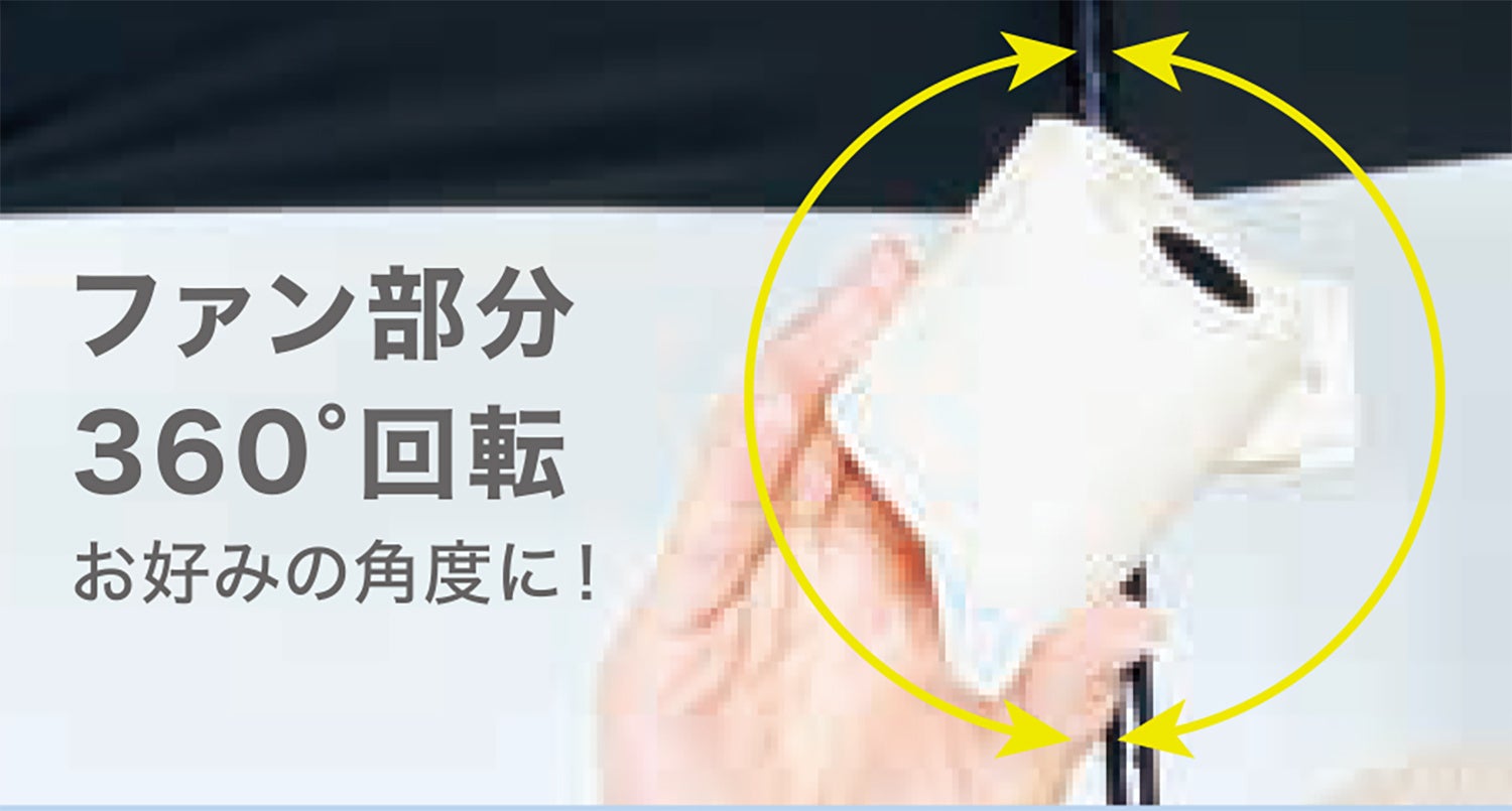 厚み約1㎝~1.5㎝ の棒状部分に対応。ファン部分は360度回転で、角度を自由に変えられるので、顔・首元・体など、風を狙った場所へ当てられます。