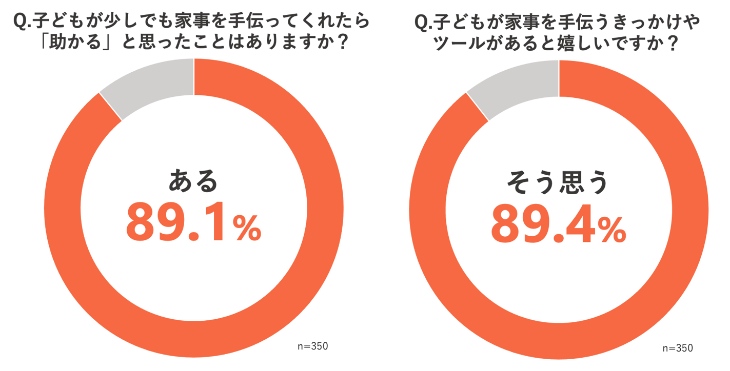 - 約90%が子どもが家事を手伝ってくれたら助かると思っており、そのためのツールがあると嬉しいと回答!さらに、81.4%が家事を家族で取り組むベストタイミングは夏休みと回答