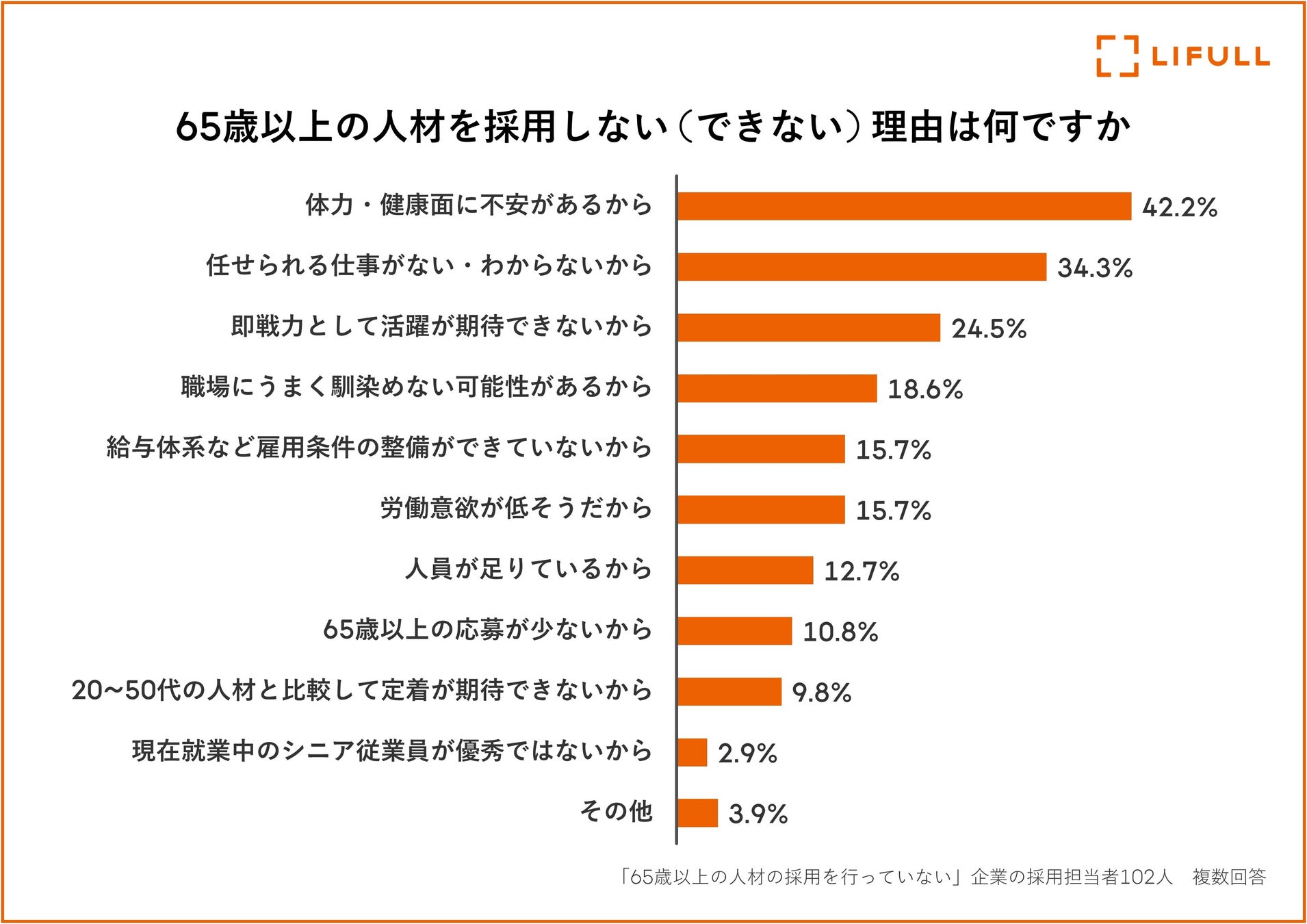 一方、65歳以上の人材を採用しない(できない)理由についても聞いたところ、「体力・健康面に不安(42.2%)」が最多、次いで「任せられる仕事がない、わからない(34.3%)」、「即戦力として活躍が期待できないから(24.5%)」が上位に上がりました。