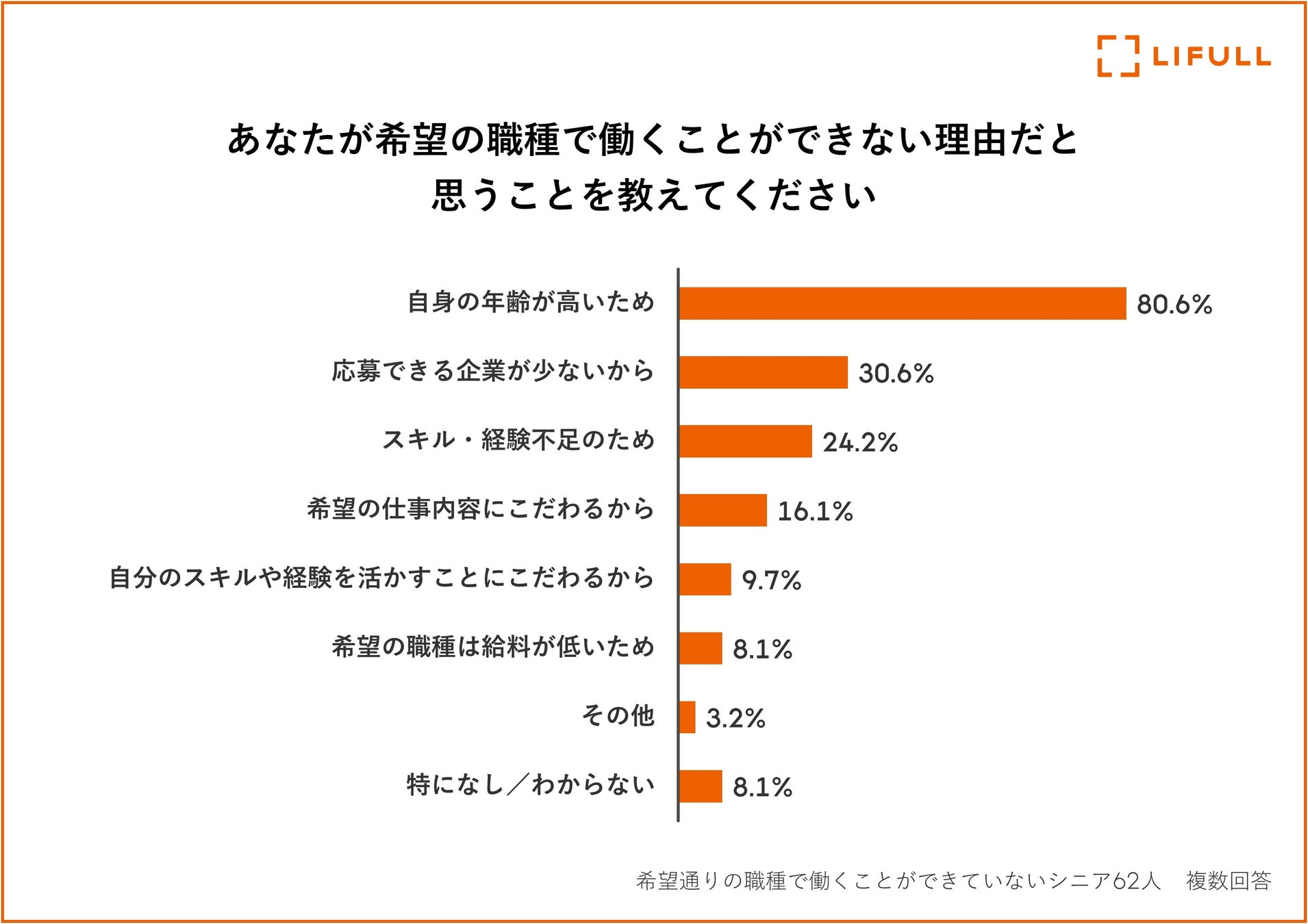 希望通りの仕事に就けていない理由は「自身の年齢が高いため(80.6%)」、「応募できる企業が少ないから(30.6%)」が上位に