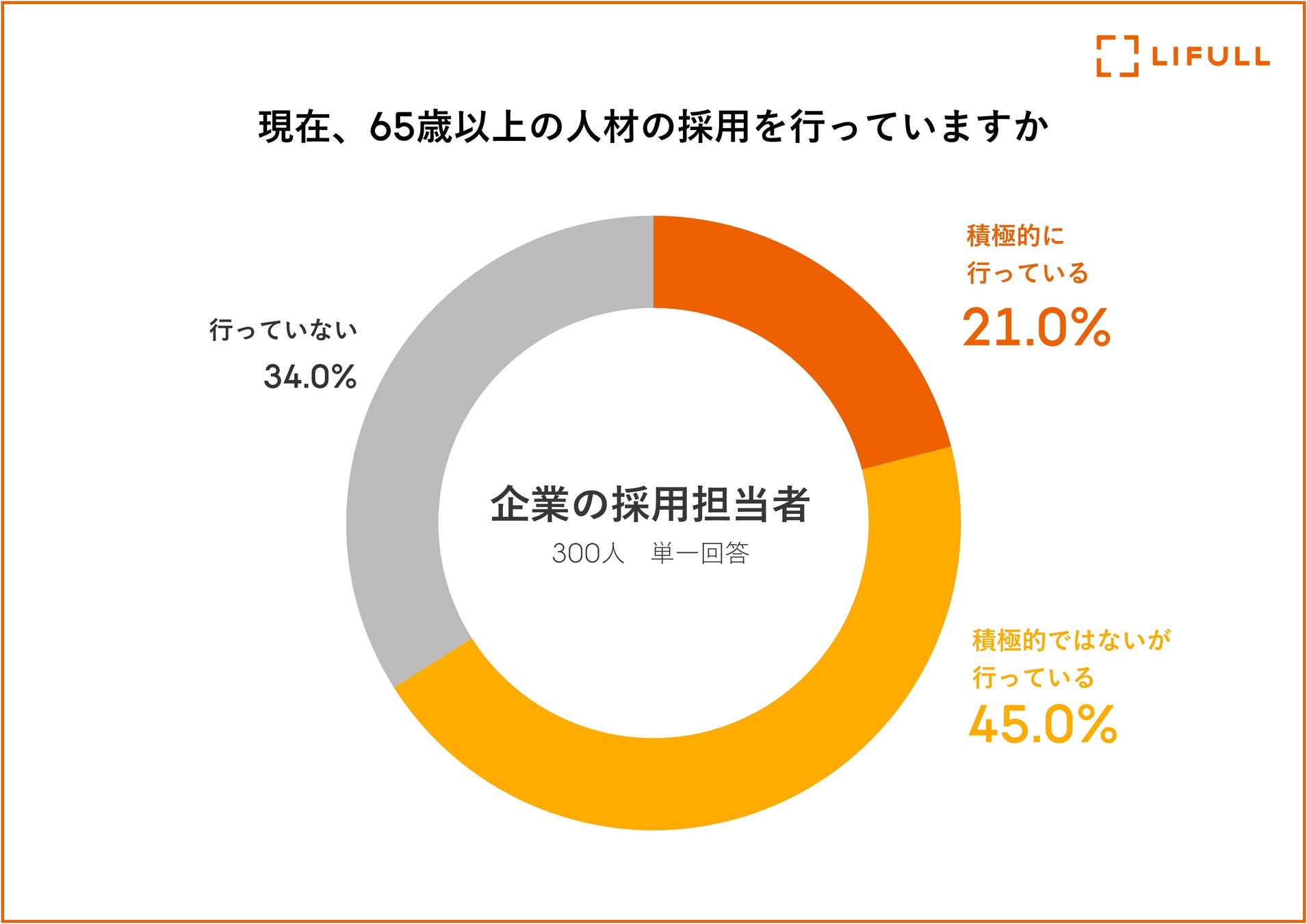 続いて、企業の採用担当者300名に65歳以上の人材の採用状況について聞いたところ、8割以上(83.0%)が人手不足であると回答していながら、現在65歳以上の人材の採用を積極的に行っているのはわずか2割(21.0%)ということが明らかになりました。