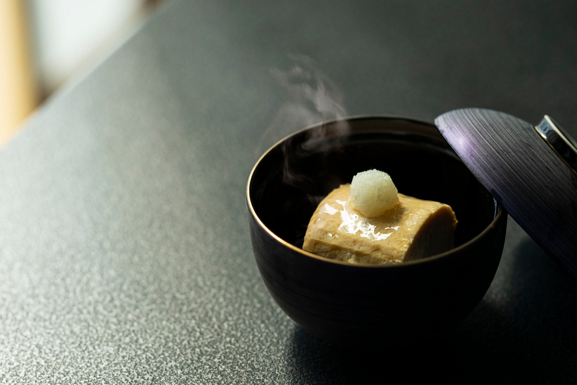 日本料理の原型をなす料理形式「本膳料理(*1)」では、漆器が使われてきたことから、「めざめの朝食」では、艶やかな漆塗りで作られたオリジナルの御膳と応量器(*2)で提供します。一本の木を轆轤(ろくろ)で切り抜き作られた、主食、副菜、汁物など五種類の入れ子状の器は、重ねて収納すると木の年輪が美しく重なります。「四角い御膳」に、「丸い器」を、縁起が良いとされる「奇数個」並べ、器づかいにおいてもバランスを保つことを重視しました。熟練した職人がひとつひとつ丹誠込めて仕上げた応量器の「美しさ」や、形や数を重んじる「日本ならではの価値観」からも、日本人らしい美意識と嗜みを感じることのできる、特別な朝のひとときです。
