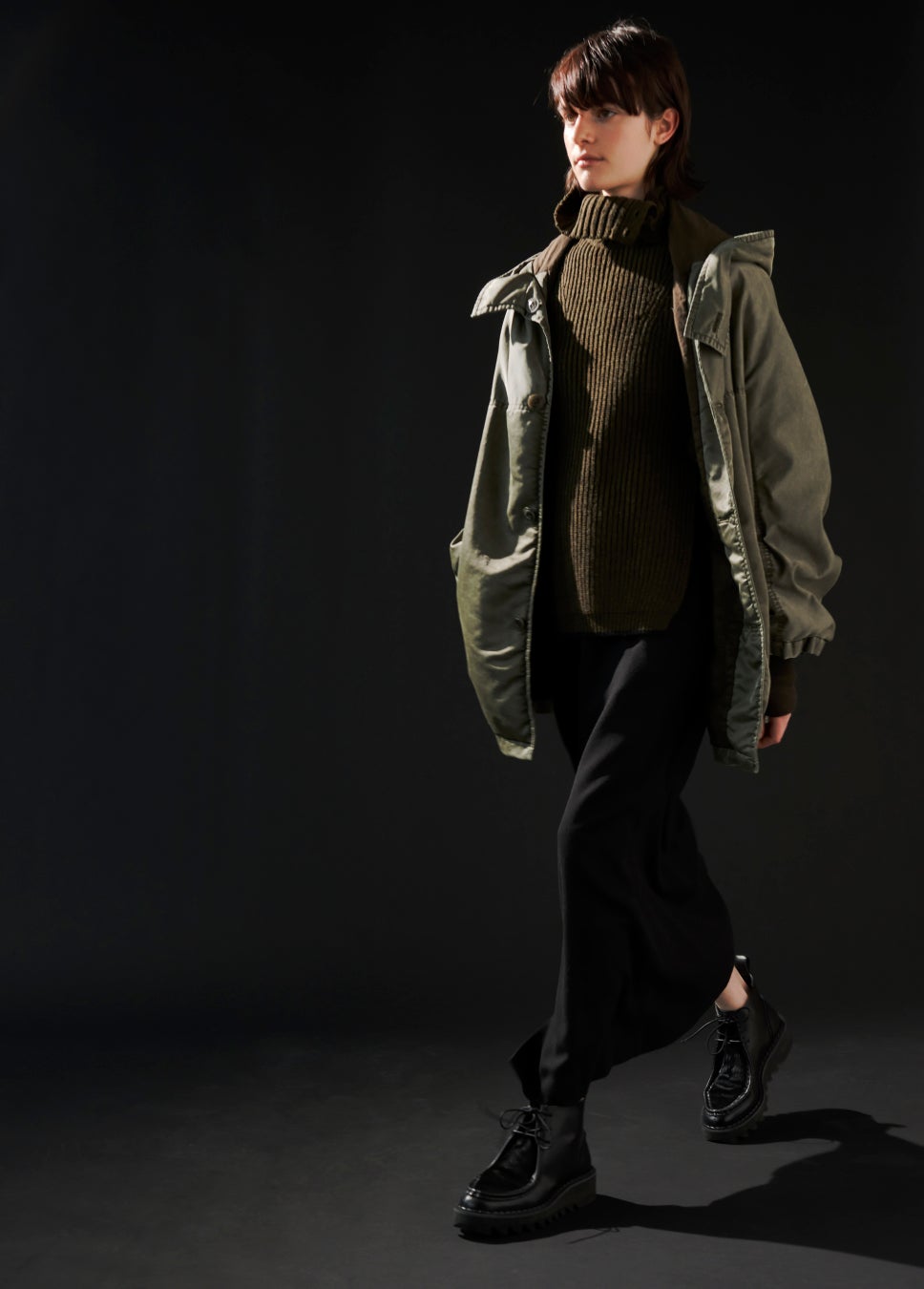 生地の状態でいつかの加工が重ねられ、最終的に製品染されたパデットコートは、着古した風合い、素朴且つ整った仕上がりの素材感を生む。フードと袖が身頃から裁ち出されひと続きのラインを描くフォルム。2023秋冬のパディッドシリーズは、裏地がコットンツイルになったリバーシブル仕立て。気軽なアイテムをユニークなシルエットで提案。