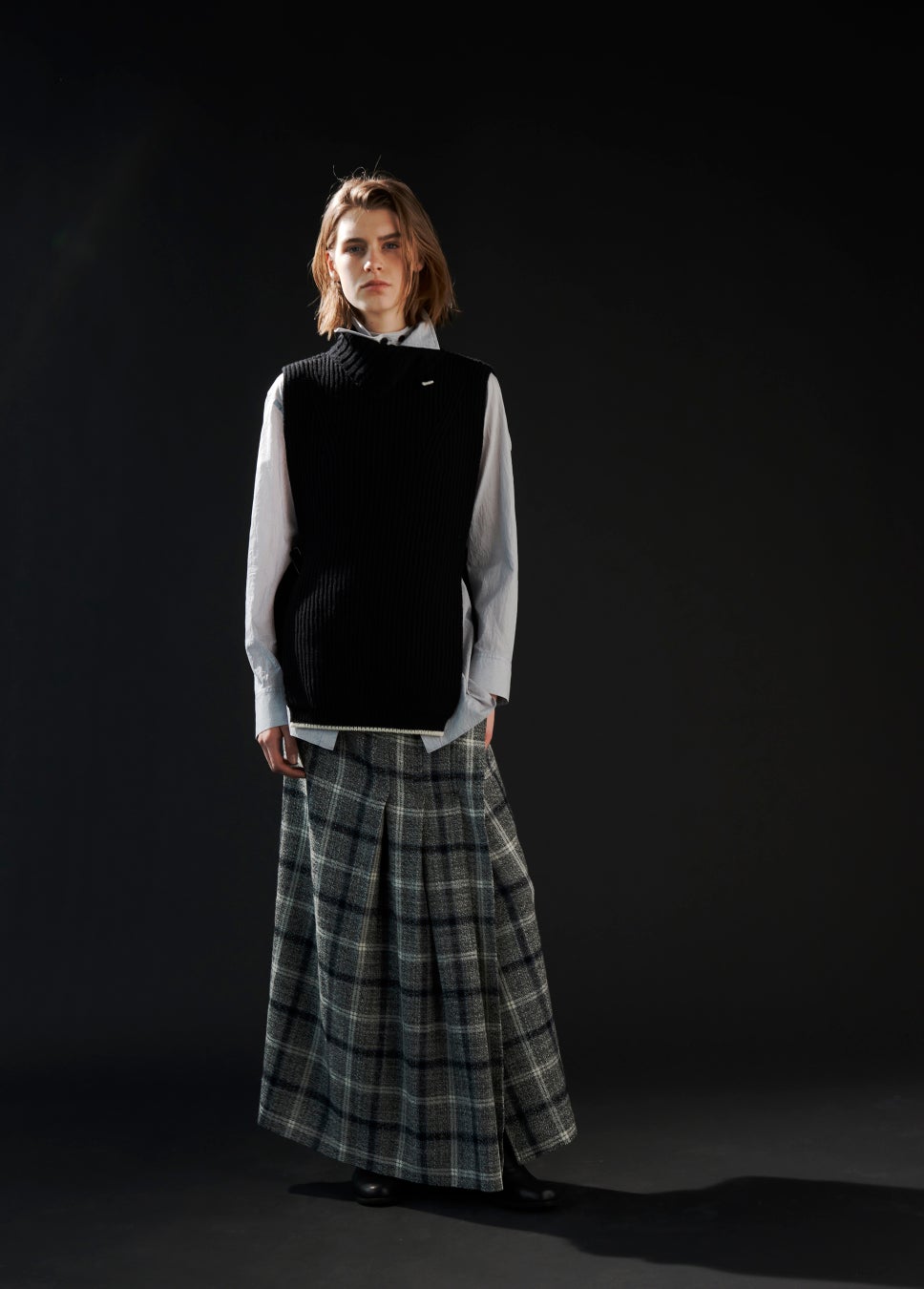 アシンメトリーラッププリーツスカート。重なる部分が斜めになり、タイトシルエットのスカートに動きを加える。アクセサリーのように身に付けるニットベストと合わせたトラディショナルな印象のスタイル。