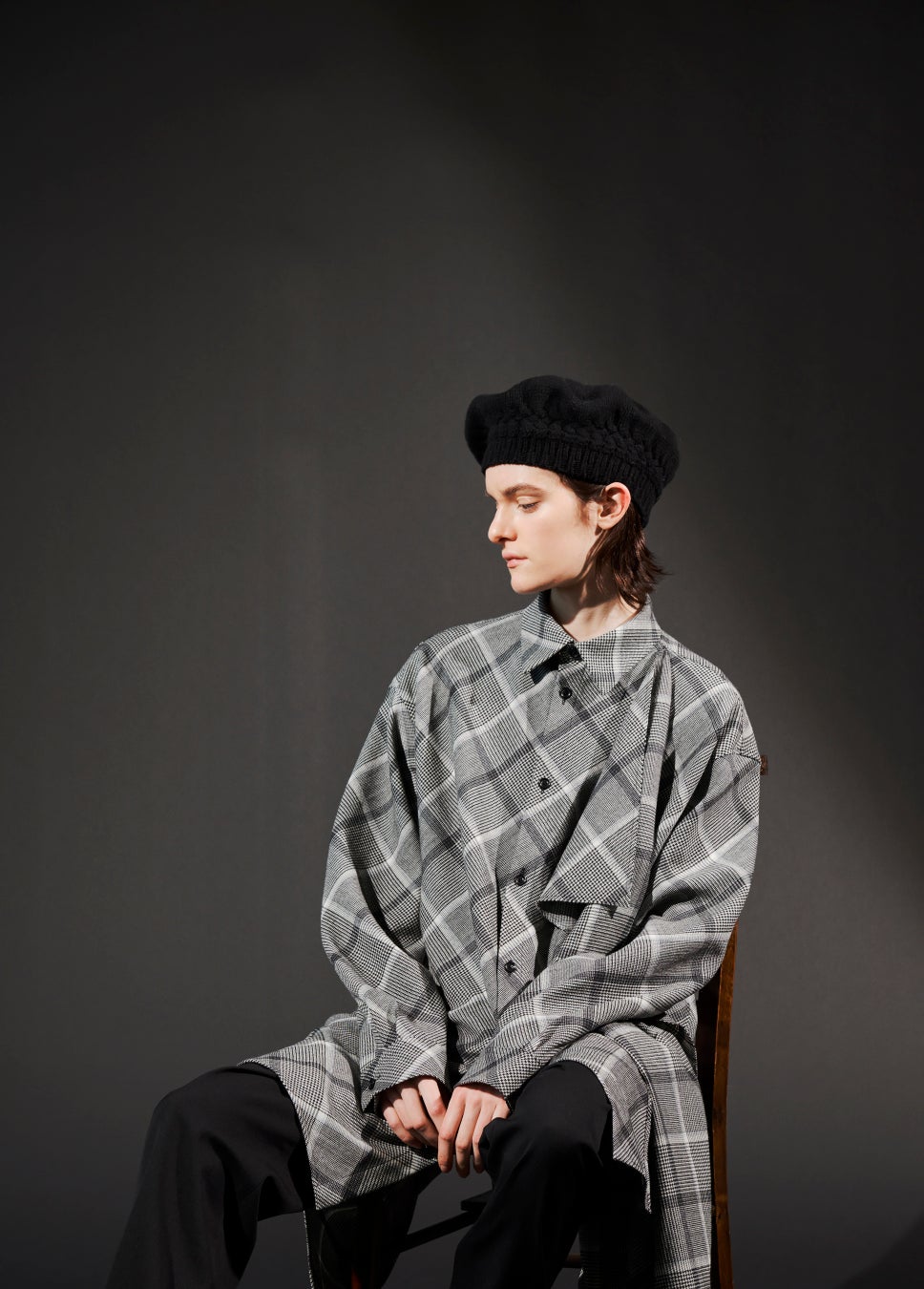 シャツの見頃につけられた断ち切りで揺れる服地が、優美な崩れたラインを描き服に流れをつくる。生まれた流れを留めることなく崩れるフォルムの妙。紳士服のようなメリノウールのサージチェック生地は、タンブラーワッシャー加工を施し、ふんわりとした風合い。