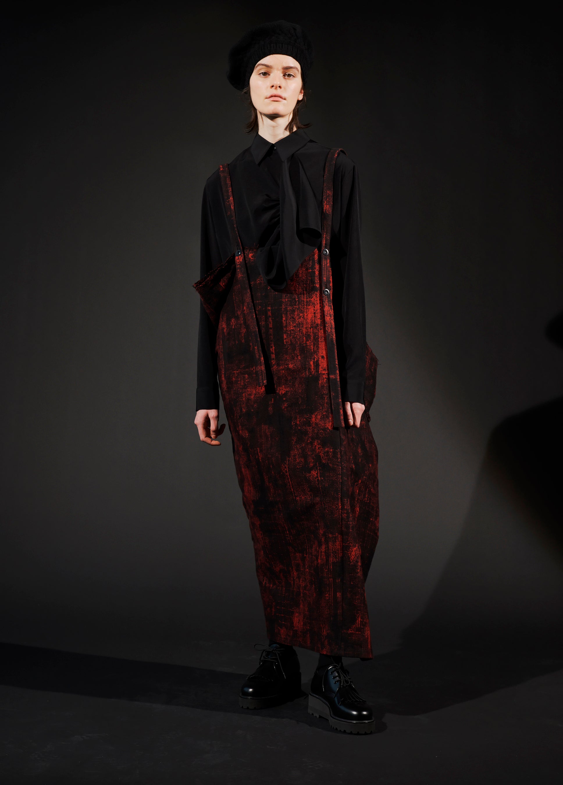 長方形のパターンが組み合わせられたストラップドレスと、前身頃にたっぷりとギャザーが寄せられた華やかなシャツ。ドレスの生地は、赤と黒のジャカード織りの生地に更に黒の古布プリントが施され、元々の赤と黒の色味、プリントの黒、表面の表情や凸凹感が混ざり複雑な表情に。断ち切られた生地の断面からは赤の糸が出るように、また、生地の裏面は黒無地に見えるように表のジャカード柄表現を損なわないよう織りが調整されている。