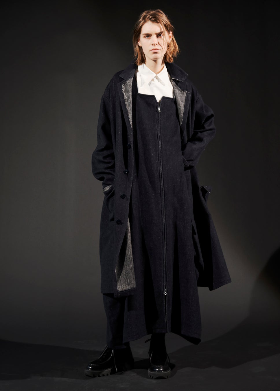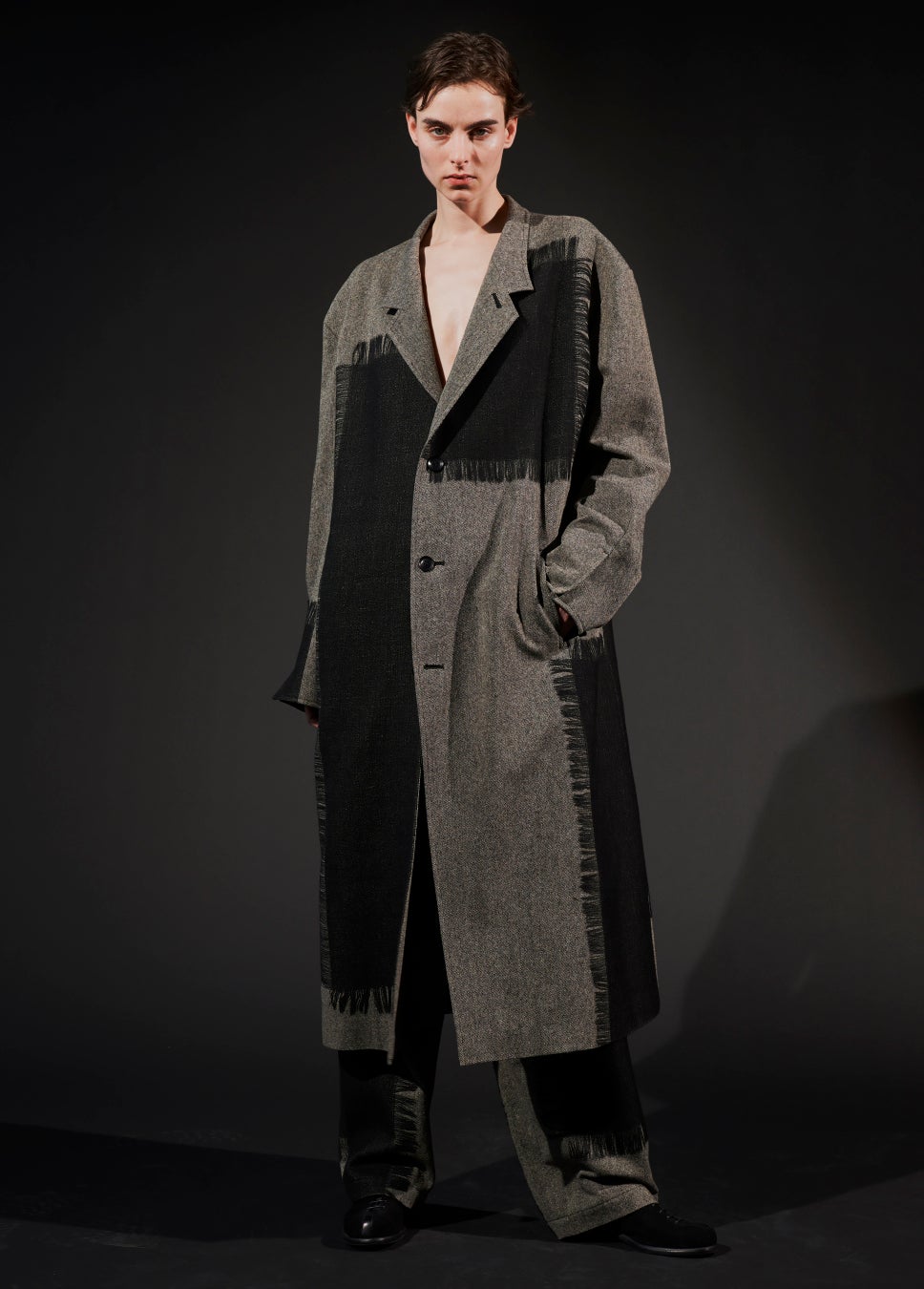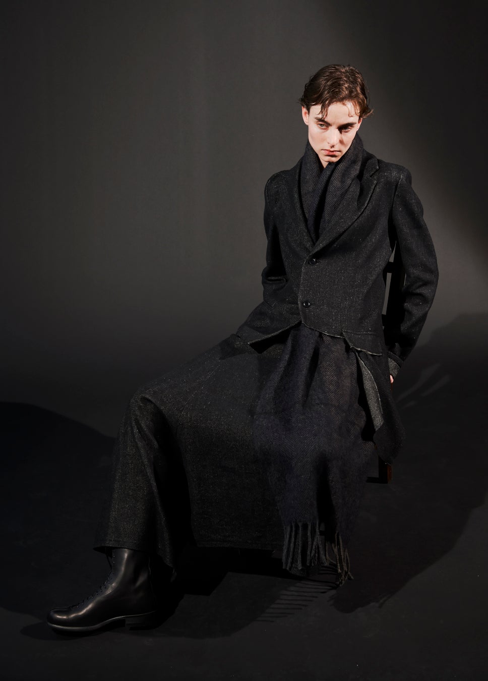 リサイクルウールを使い、生産加工の様々な工程により原毛に使い風合いを実現した、英国調ツイードに仕上げられた生地でつくられたテーラードコートとパンツのクラシックスタイル。ウールガーゼでフリンジの意匠をつくり、できる限り真っ直ぐになるようにニードルパンチされ、ストールが生地に取り込まれたように見えるユニークな柄。