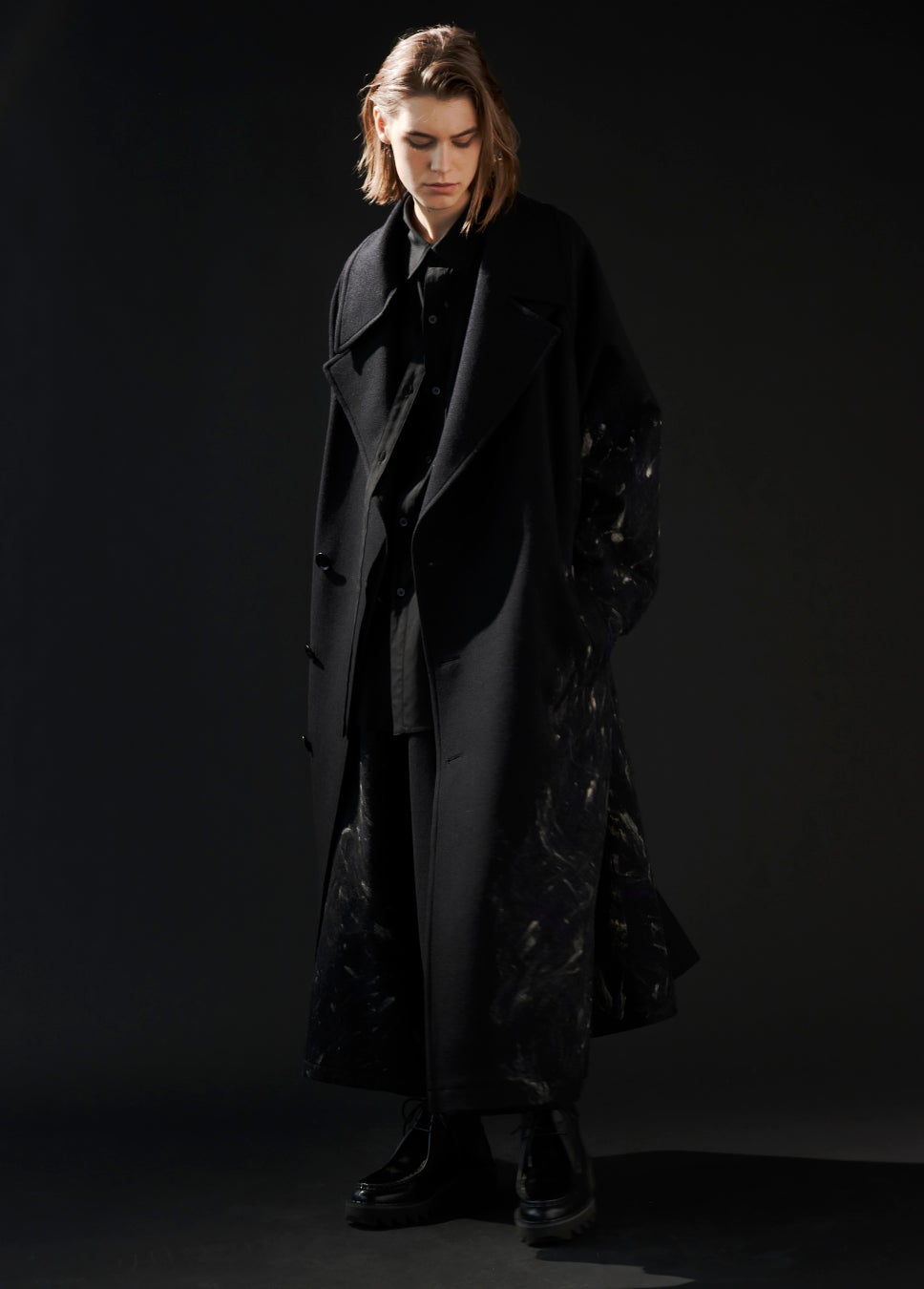 原毛の綿が部分的にニードルパンチで取付けられ柄のように表現されたウール生地で仕立てられた、オーバーサイズのダブルブレストコートと、丸みを帯びたクラシックなシルエットのパンツ。綿は厚みを揃えながら形がつくられ、手仕事の風合いと機械的な硬質さが生地に表現された、柔らかな風合いと、強さが共存する印象的なピース。