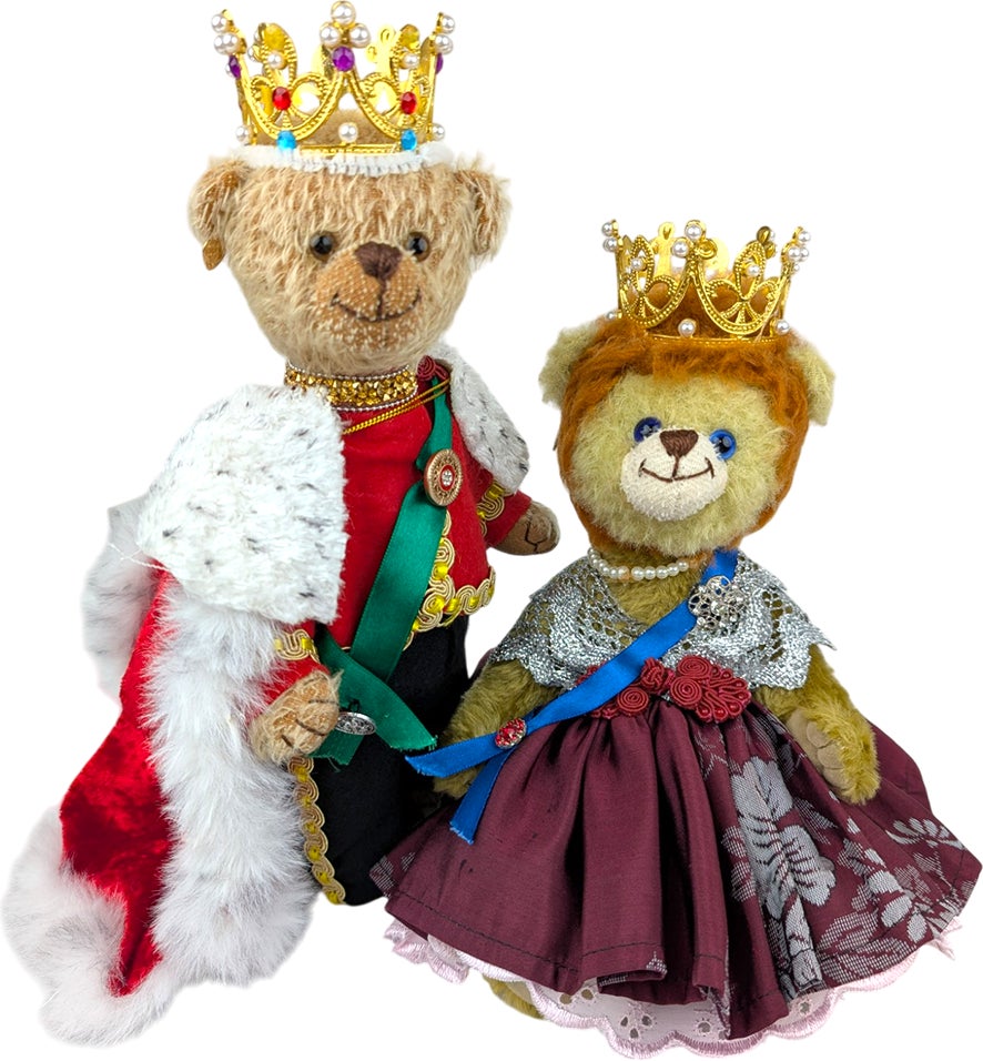 チャールズ国王とエリザベス女王をイメージして作成されたテディベアのセットです。英国のテディベア作家ジム&ドリーンピャット夫妻の手掛ける1点物です。