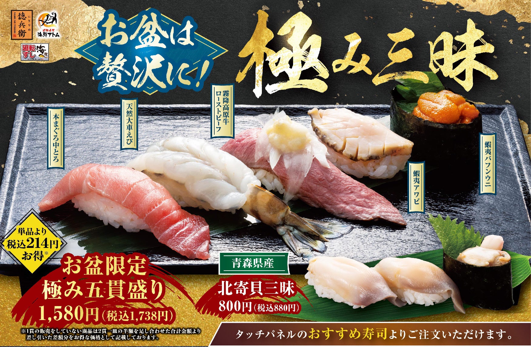 にぎりの徳兵衛など45店舗でお盆限定の特別なごちそう寿司に舌鼓!霧降高原牛、蝦夷アワビ、蝦夷バフンウニなど「極み三昧」販売!