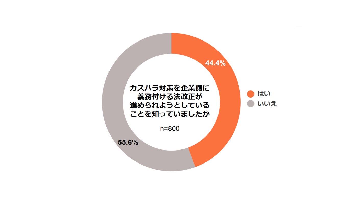 「カスハラ対策を企業側に義務付ける法改正が進められようとしていることを知っていたか」(回答者は東京都民以外も含む)と尋ねたところ、「はい」との回答が44.4%になり、半数近くが認知していることが明らかになりました。一方、「いいえ」との回答は55.6%でした。
