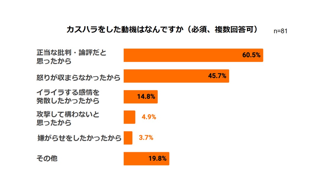 カスハラをした動機を尋ねたところ(複数回答可)、「正当な批判・論評だと思ったから」が60.5%でもっとも多く、「怒りが収まらなかったから」が45.7%と続き、その場では、正当なものだと認識していた実態が浮き彫りになりました。