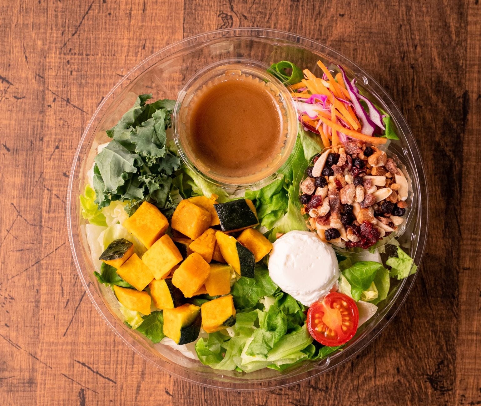 今回は、ほくほくとした食感と甘味が特長の北海道産栗かぼちゃが主役のサラダです。国産ケールに加え、様々な食感と味わいをお楽しみいただけるよう、マスカルポーネチーズやナッツ、ドライフルーツをトッピングしました。さらに、芳醇な香りとまろやかな酸味の「バルサミコ酢入りはちみつドレッシング」で、奥行きある味わいに仕上げています。具材からドレッシングまで、サラダ専門店のこだわりが詰まったボリューム満点のサラダとなっています。この機会にぜひお楽しみください。