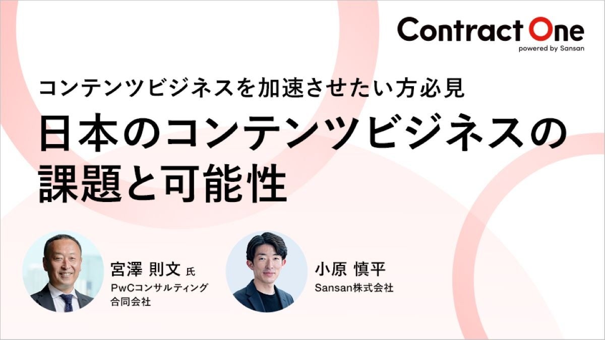本セミナーでは、PwCコンサルティング合同会社でEntertainment & Mediaセクターのメディア・広告業界を担当する宮澤則文氏より、コンテンツビジネスの概況を踏まえ、コンテンツの企画・制作と流通を加速させるためのデジタル基盤の整備やプロジェクト管理、さらにコンテンツのライセンス情報や契約情報を一元管理し、効果的に活用することの重要性を解説します。また、契約DXサービス「Contract One」を提供する当社の小原慎平より、具体的な事例をもとに契約情報のデータ化・活用方法をご紹介します。