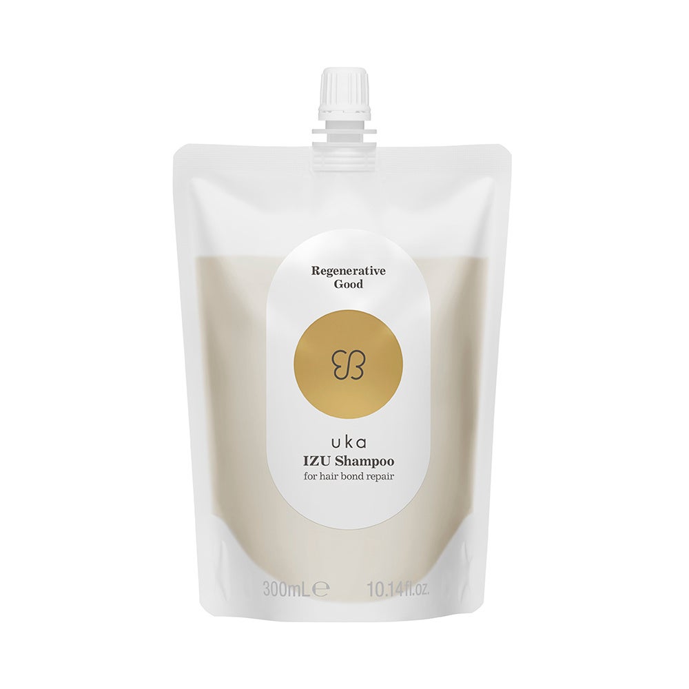 ダメージシャンプーとの違いは、“補修力の次元”。ukaが着目したのは、髪の中の結合(ボンド)です。毛髪補修成分である反応型ケラチン加水分解ケラチン(羊毛)を中心に、ダメージホールを埋め、毛髪内部の3次元構造を補修します。ファイバーハンス、トステア、レブリン酸といった再結合型成分が連動し、熱(ドライヤーやアイロン)を味方にして、髪の内部を補修。ノンシリコンでありながらサロン級の潤いと補修を両立ししなやかで、芯のある髪へと導きます。300mLのスパウト(蓋)付きのリフィルも同時に発売、環境にもやさしく、本体より約12%お得です。IZUシリーズ共通パッケージで新たにボトル購入の必要がなく、既存ラインからの移行もスムーズ。