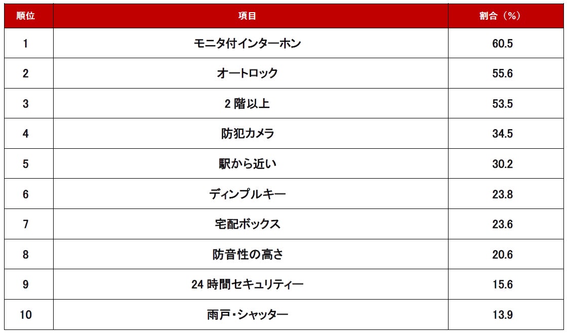 Q. 防犯を気にする一人暮らしのお客さまが、チェックするべき住まいの条件・設備を教えてください。(複数回答/上位10項目)