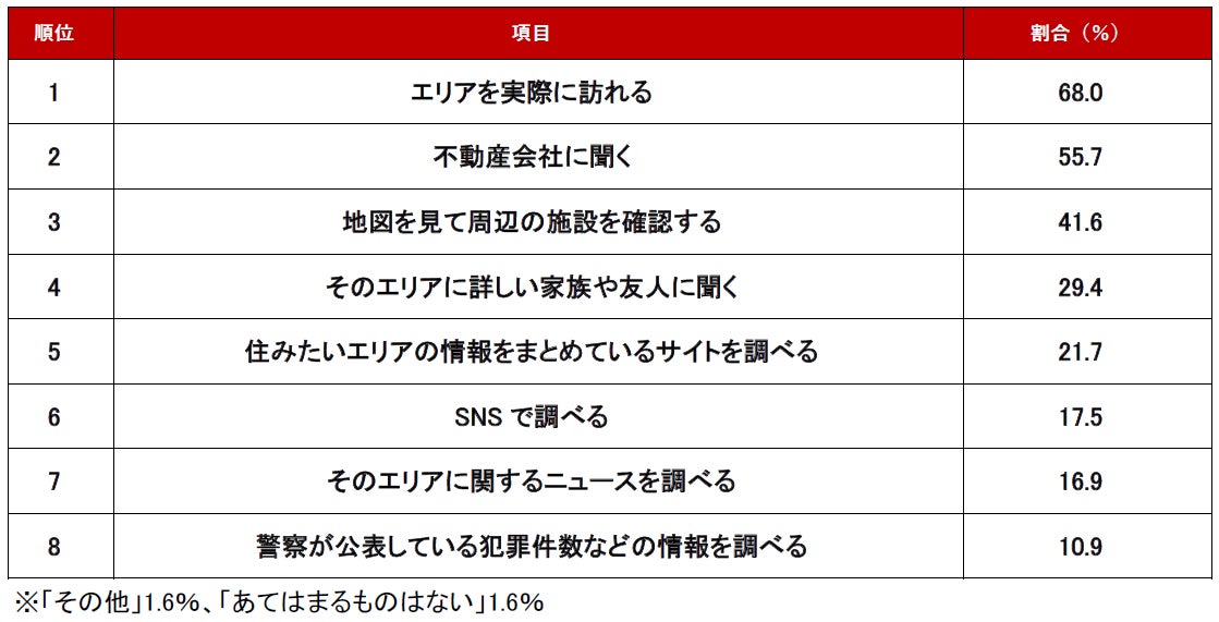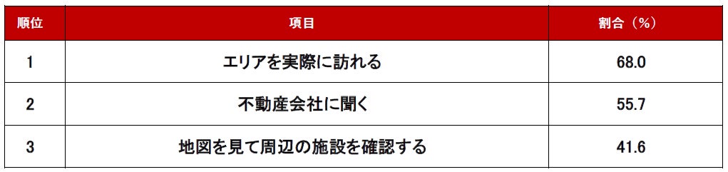 続いて2位は「不動産会社に聞く」でした。そのエリアに詳しい不動産会社に聞けば、遠方などの理由で実際に訪れることができない場合でも、周辺環境について知ることができます。