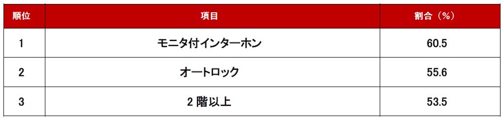 2位は「オートロック」で、1位の「モニタ付インターホン」と同様に、玄関回りの設備が続きました。