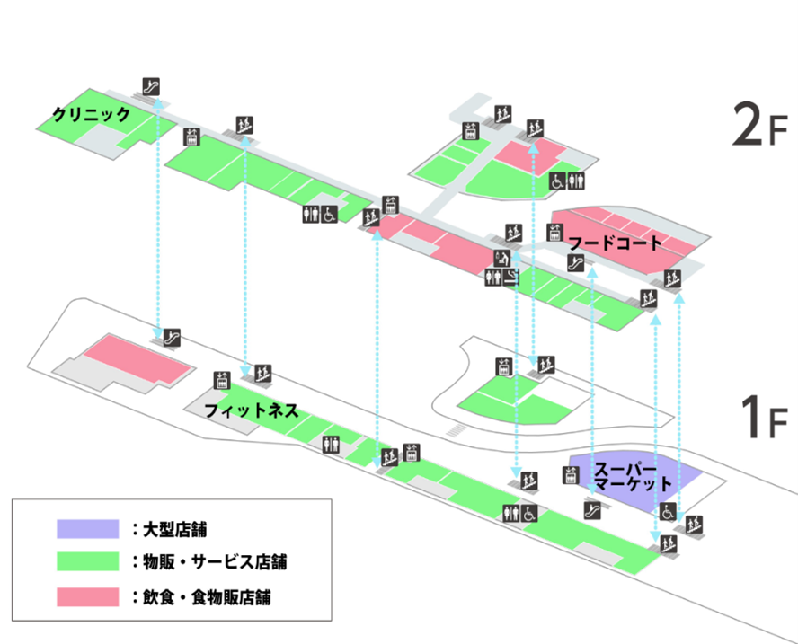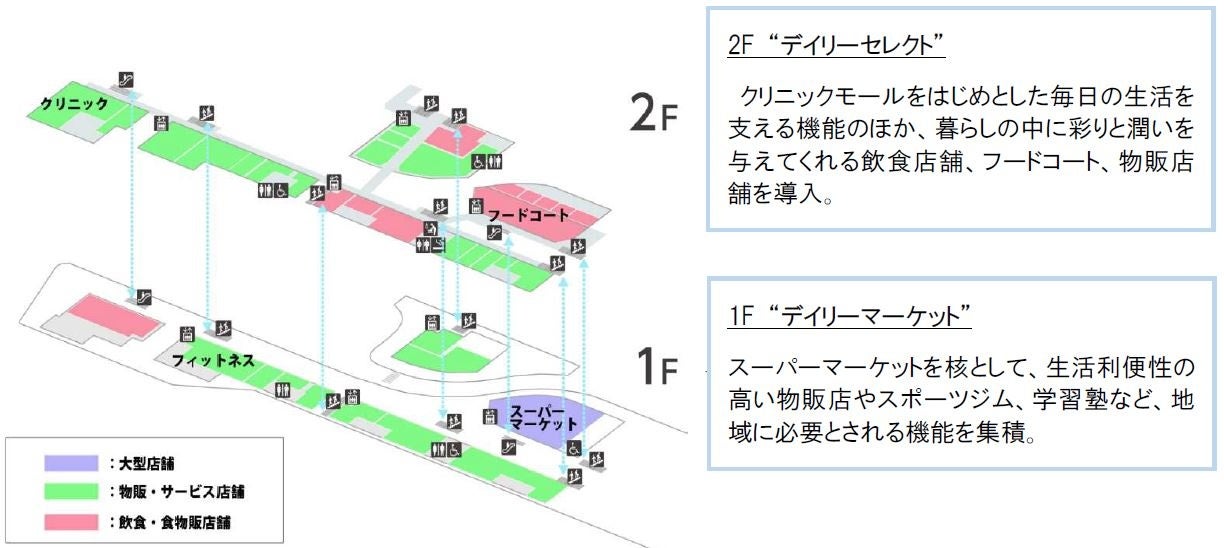 スーパーマーケットを核として、生活利便性の高い物販店やスポーツジム、学習塾など、地域に必要とされる機能を集積。